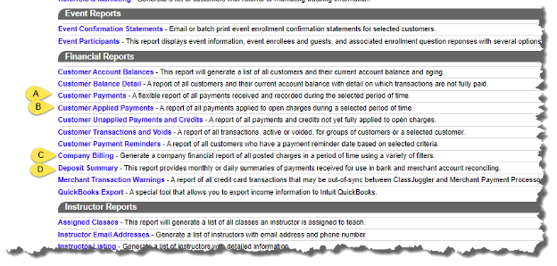 Four of the most important reports for your monthly bookkeeping and tax preparation are the Customer Payments, Customer Applied Payments, Company Billing, and Deposit Summary financial reports. Here's how: