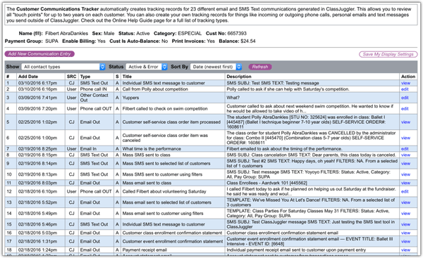ClassJuggler has dozens of built-in communications tools, from emailing account statements, payment receipts, to mass emails and text messages. With the new Communications Tracker, ClassJuggler will automatically log 23 different communications for you!