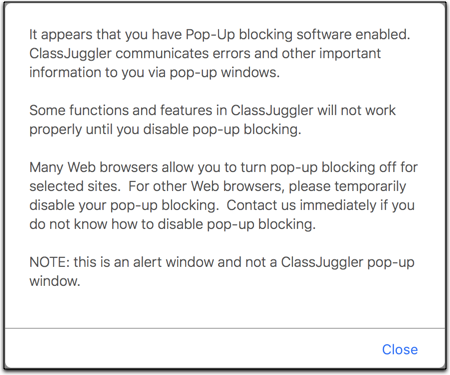 Having trouble disabling your pop-up blocker when using ClassJuggler? This is a necessary tweak to your web browser software, and if not handled correctly can cause confusion and make it seem like ClassJuggler is not working.