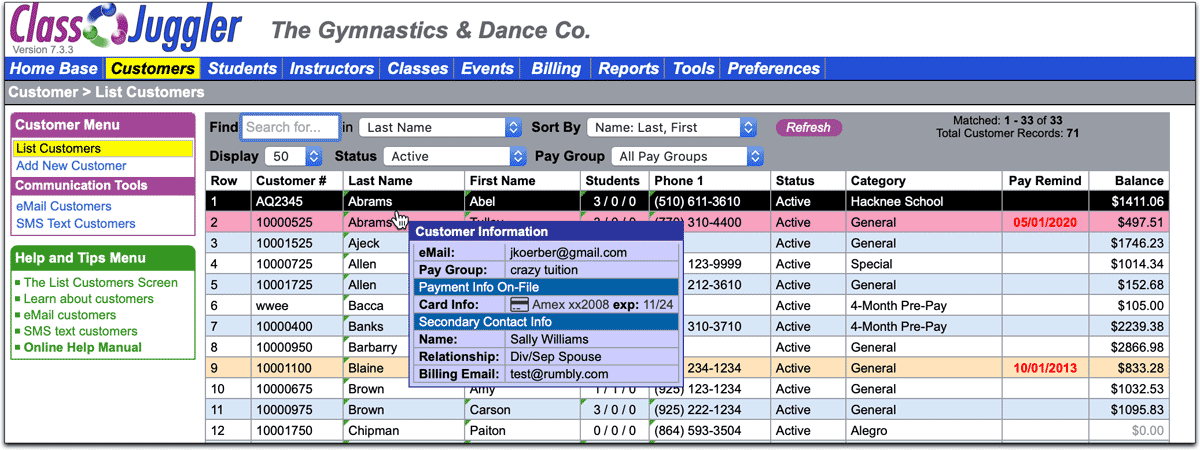 in a listing column, it means you can hover your mouse over that column to see additional information without having to drill-down into the record. Below is a great example of hovering over the name column in a customer listing. Here we can see many additional fields of information about the customer, including payment info, classifications, email address, etc. all without leaving the listing screen.
