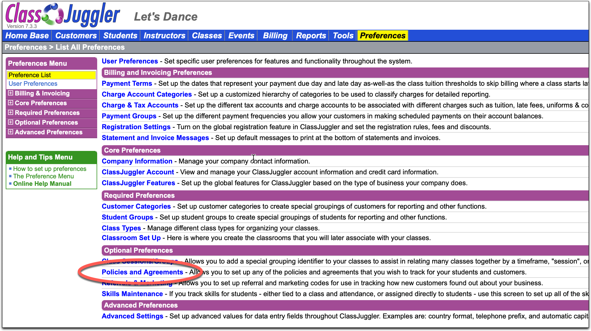 Most class-based businesses that teach children have policies that they require each customer (family) to agree to before participating in classes. ClassJuggler has features to help you easily manage and track compliance with all of your important policies. You'll find the Policies & Agreements screen (under Optional Preferences) from the Preferences main menu. This is where you can set up all of your legalese policy verbiage.